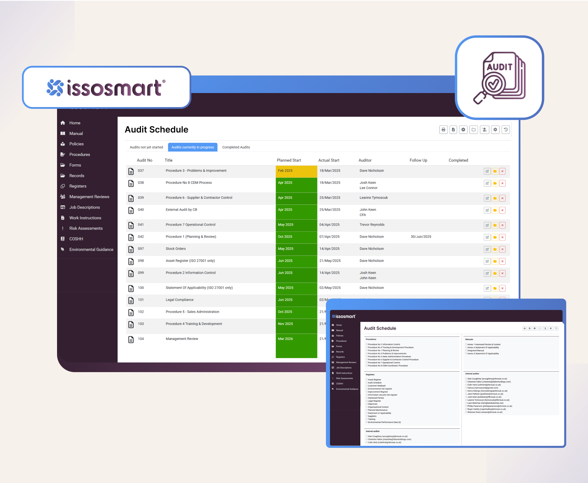 issosmart brings compliance, documentation, and audits together in one seamless platform. No more scattered tools, missed updates, or audit stress – just streamlined compliance that keeps you ready, secure, and in control.